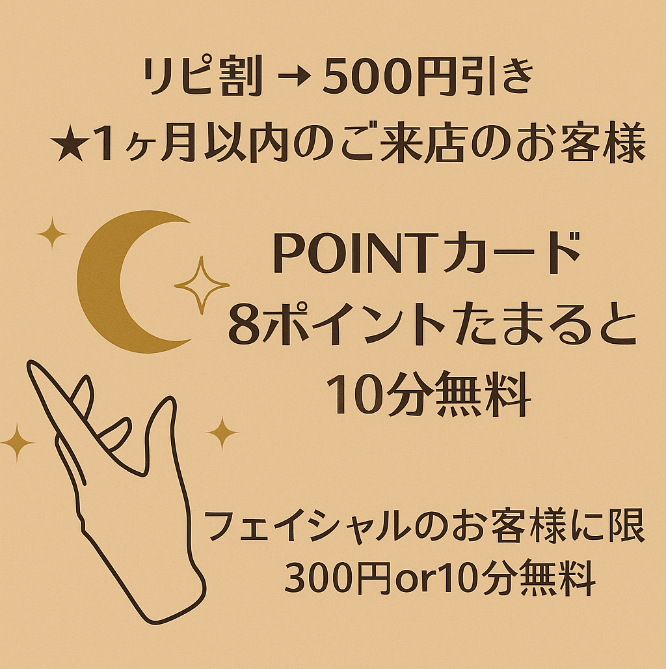 🔹 リピート割引:1ヶ月以内の再来で 500円引き